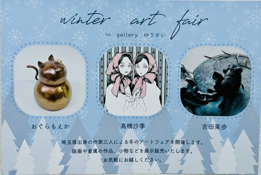 おぐらもえか、高橋沙季、吉田果歩、埼玉出身の作家3人による冬のアートフェアーを開催いたします。版画、金属の作品、小物などを展示販売いたします。お気軽にお越しください。