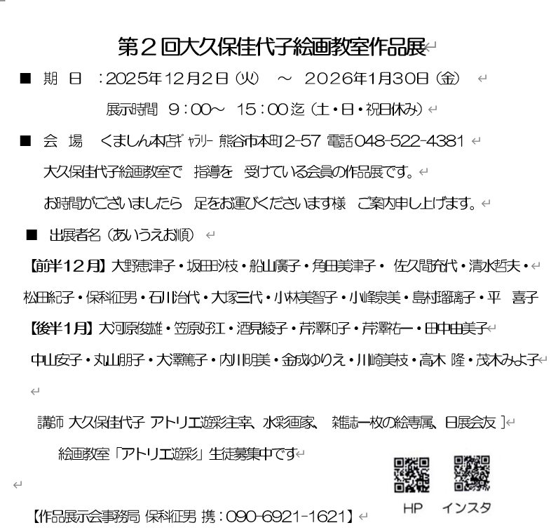 第2回大久保佳代子絵画教室展くましん本店ギャラリー 12/2~1/30