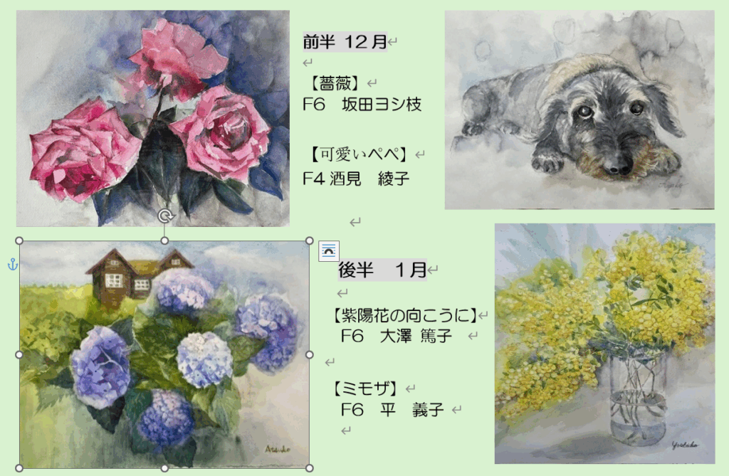 普段お教室で描いた作品や今年1年の自信作を前半12月後半1月とメンバーを変えて出品させていただきます。是非、ご高覧ください。 また、絵画に興味のある方、皆さんと一緒に学んでくださる方募集中です。是非、ご高覧ください。
