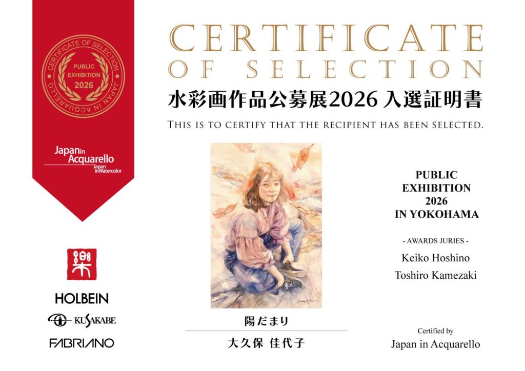 イタリアの国際展覧会 fabriano in acquarello 2026の日本選抜のための公募展です。今回は66点の作品が選抜され、その中からmaster artist 2名、new talented artist 2名、と4名がイタリア代表に選出されます。 誠に光栄なことに、イタリア代表でマスターアーティストに選出していただきました。会場ではデモンストレーションも披露させていただき、大変充実した日々を過ごさせていただきました.今後とも素敵な作品を発表できるように精進して参ります。 大久保佳代子